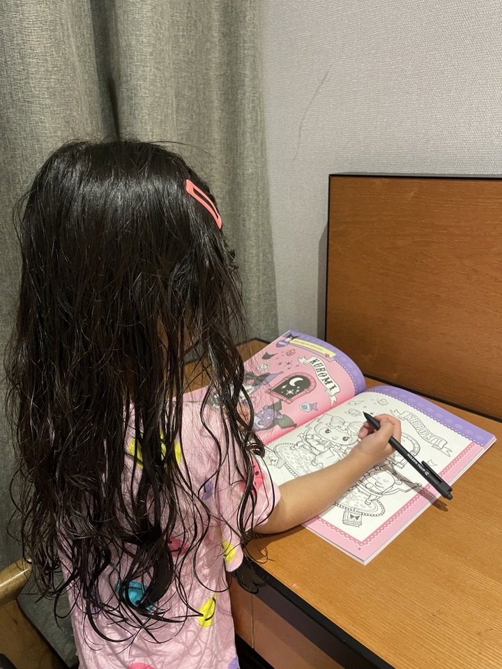 칙칙폭폭 기차놀이를 하며 서로 끌어안고 5분 거리를 20분에 걸쳐서 드디어 도착했다. 그냥 헤어지기에 아쉬워하니 1층에 있는 아이스크림 할인점에서 아이스크림 하나씩 먹고 올라가기로 했다. 숙소에 올라와 씻고 워크북 하며 잠드는 0일 차. 으니 취향 저격 쿠로미 색칠공부 준비해 준 언니에게 참으로 고맙다. 으니는 그렇게 기절 아닌 기절을 하고, 우리도 기절직전이었으나 이렇게 첫날밤을 보내기에는 아쉬운 마음에 간단히 육포와 맥주 한 잔을 하며 내일 여행준비를 마무리하였다. 우리 한 달간 여행 잘할 수 있겠지? 푹 자고 내일 무사히 떠나보자!!