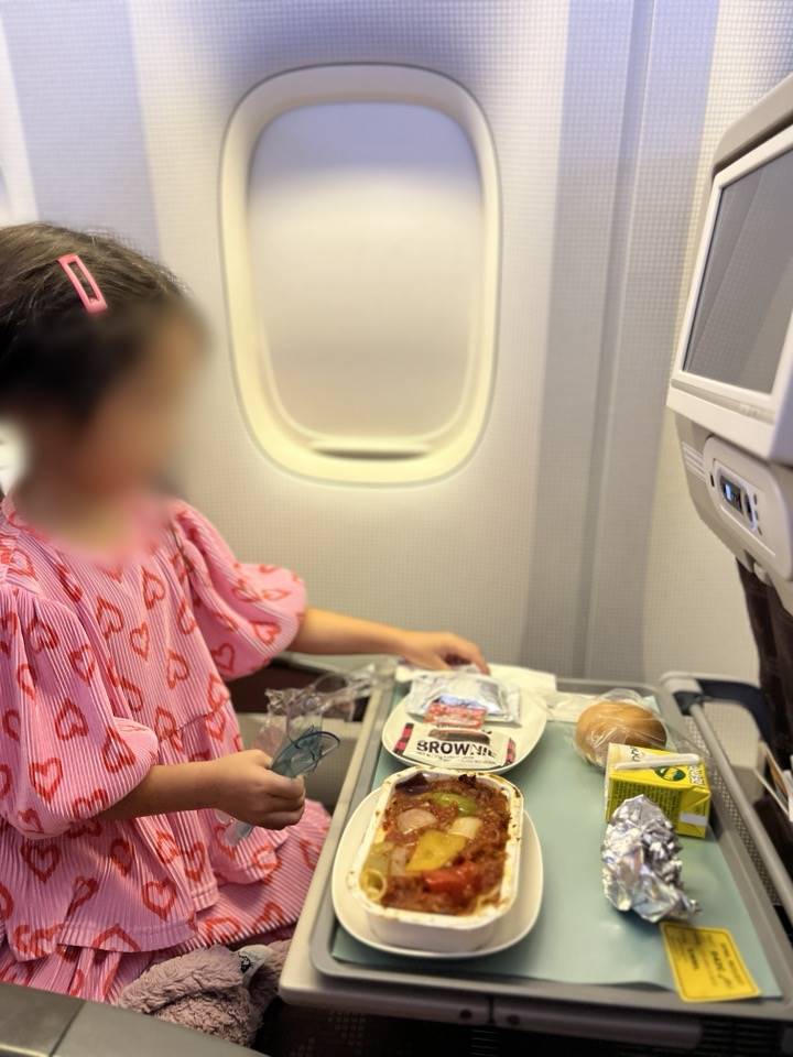 나이대가 다양한 인원이었기에 기내식도 다양하게 맛볼 수 있었다. 성인은 따로 신청하지 않았기에 남아있는 기내식 중에 골랐는데 젤 오른쪽 사진의 내 기내식은 된장 술밥에 요거트가 후식으로 나오는 메뉴였다. 따뜻하게 나오는 강된장에 나물을 비벼먹으니 그동안 먹었던 기내식중에 맛이 제일 좋았고, 후식으로 화이트 와인 한 잔 먹으니 딱 궁합이 좋았다. 아이들은 미리 특별 기내식을 신청해서 먹었는데, 불고기 볶음, 치즈 스파게티, BBQ치킨 중에서 고를 수 있다. 치킨과 불고기 볶음보다는 레토르트 맛에 익숙한 치즈 스파게티가 제일 인기가 좋아 아이들 모두 나눠먹기도 했다.
