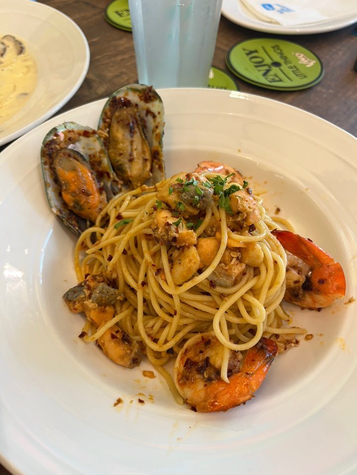 누가 만들어도 중간이상은 할 것 같은 이탈리안 레스토랑. 우리의 첫 외식장소이다. 강렬한 양념 냄새가 코끝을 찌르는 바비큐 집도 있고, 너무나 익숙한 피자헛도 있었지만, 몇 안 되는 후기에 맛이 괜찮다는 평이 많았던 VIVO로 가기로 했다. 어른 넷에 아이 셋. 아침도 제대로 먹지 않아 모두 배가 고프다. 괜찮아 보이는 메뉴는 다 골고루 시키기로 했다. 익숙하지 않은 메뉴에 상의까지 하면 일정이 길어질 것 같아 전적으로 나에게 메뉴 선택권이 주어졌다. 잘 시켜야 한다. 토마토 스파게티, 로제 스파게티, 크림 스파게티, 그리고 매콤한 해산물 오일 스파게티까지 일단 종류별로 시켜보았다. 빠지면 섭섭한 감자튀김과 생선가스도 주문했다. 돼지고기 돈가스보다 생선가스가 일반화되어 있는지 피쉬앤칩스는 흔히 볼 수 있는 메뉴였다. 토마토 순이 으니의 입에도 크림이 더 맛있었는지 아이들은 크림 스파게티를 뚝딱해 치웠고, 어른들은 매콤한 오일 스파게티가 입에 가장 맞았다.